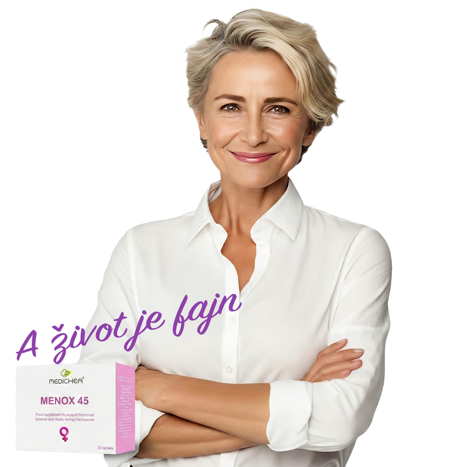Užívám Menox 45 již 3 měsíce a musím Vám popsat bezva účinky. Trpěla jsem velkými návaly horka a některými dalšími vlivy menopauzy. Vaše webové stránky jsem pak objevila náhodou. Od té doby, co užívám Menox 45, všechny mé potíže téměř zmizely. Nevím, jestli to má vliv, ale můj partnerský život se také zlepšil.